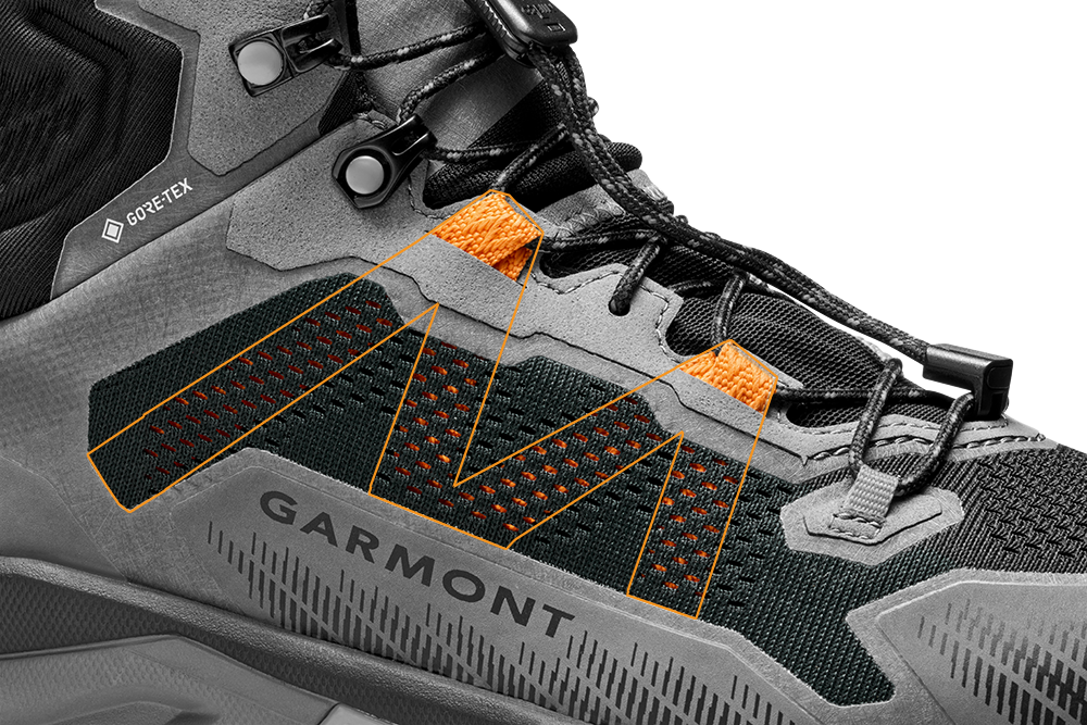 G-WRAP technology acts between the upper and lining in the forefoot area through the lacing. Tightening the laces puts tension on the G-WRAP structure, which will tend to wrap around the foot for an immediate feeling of stability and security.